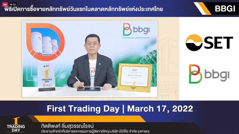 ‘บมจ.บีบีจีไอ’ หรือ BBGI ผู้นำอุตสาหกรรมพลังงานเชื้อเพลิงชีวภาพ และผู้สร้างสรรค์ธุรกิจผลิตภัณฑ์ชีวภาพมูลค่าสูง (HVP) ที่ส่งเสริมสุขภาพ นำหุ้นเข้าซื้อขายในตลาดหลักทรัพย์แห่งประเทศไทย (SET) เป็นวันแรก 17 มี.ค. โดยใช้ชื่อย่อ BBGI ในการซื้อขายหลักทรัพย์ ผู้บริหาร-ที่ปรึกษาทางการเงินมั่นใจ นักลงทุนให้การตอบรับคึกคัก ด้วยพื้นฐานที่แข็งแกร่ง ชูจุดเด่น ผู้นำตลาด HVP ส่งเสริมสุขภาพในภูมิภาคอาเซียน